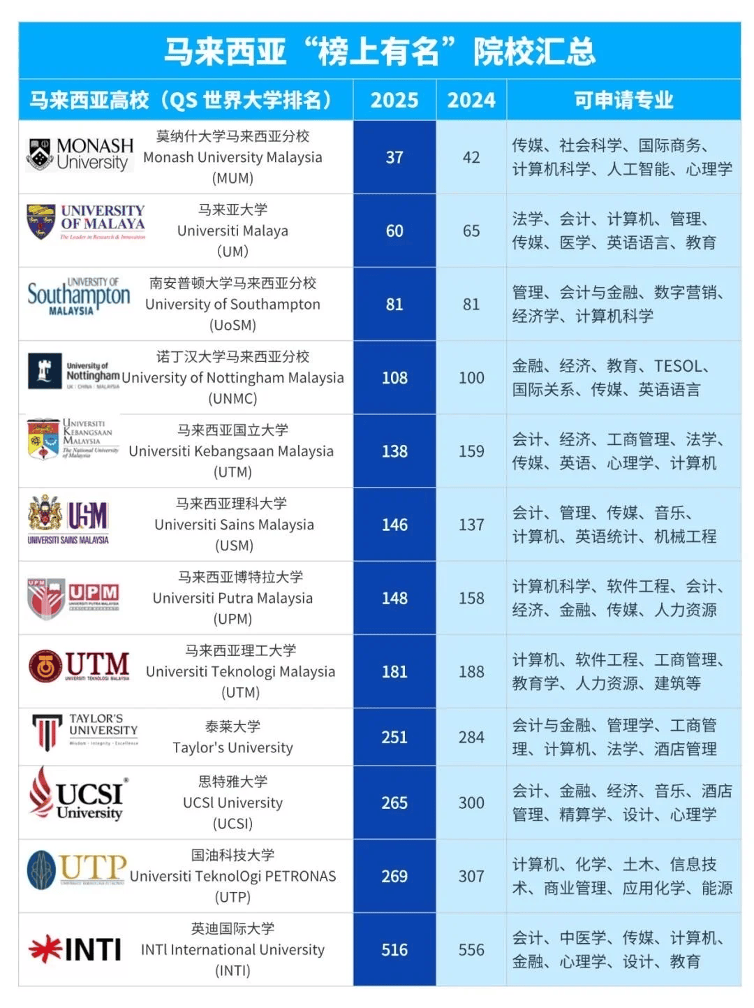 马来亚大学Universityof Malaya1905年建校,公立研究型分析大学,位于马来西亚首都吉隆坡。环承平洋大盟,亚洲大盟,东盟大盟,全球产学将来人才培育策略联盟!以文理学科和医学著称正在很多学科范畴享有世界级的声誉,多个学科范畴进入世界前200名,此中17个学科范畴进入世界前100名。正在2025年高档教育研究机构QS发布排名中,马来亚大学位列全球第60位。马来西亚国立大学TheNationalUniversity of Malaysia1970年建校,马来西亚五所公立研究型大学之一;2011年,学校正式核准中文名字为马来西亚国立大学;东盟大盟,英联邦大学协会,亚洲取承平洋大学协会;共有13个学院是一所分析型大学,专业普遍,有文、理、工、商、医科等各类专业,被泰晤士报教育专刊列为世界科技类大学100强。正在2025年高档教育研究机构QS发布排名中,马来西亚国立大学位列全球第138位。马来西亚理科大学UniversityofScience Malaysia1969年建校,公立研究型分析大学;素有“亚洲的花圃大学的佳誉,具有三个校区,共28个学院及26个研究核心,500多个专业范畴的硕士和博士学位课程;东盟大盟。艺术学、理学、工学医学为马来西亚国度沉点学科。正在2025年高档教育研究机构QS发布排名中,马来西亚理科大学位列全球第146位。马来西亚博特拉大学Universiti Putra Malaysia1931年建校,东南亚出名分析性研究型大学;91%的教师具有博士学位;养分学、农业和林业专业位居马来西亚第一;经济取办理学院和商学院同时荣获AACSB商学院认证,是马来西亚第一个世界级经管院取商学院;文学、英语、科学、教育、计较机科学取消息、会计取金融、工商办理、经济学取计量经济学、电子工程、机械工程和化学工程范畴,位居世界学术排行榜200强;2025年高档教育研究机构QS发布排名中,马来西亚博特拉大学位列全球第148位。马来西亚理工大学University of Technology Malaysia1984年建校,公立研究型大学,从校区位于柔佛州新山市,分校正在吉隆坡市核心(研究生院),利于英语能力的提高,同时学生可选择专业面广;以办理和手艺类专业见长,专业劣势出众,就业前景好。2025年高档教育研究机构QS发布排名中,马来西亚理工大学位列全球第181位。伍伦贡大学马来西亚校区University of Wollongong Malaysia始建于1951年,正在全球有四个分校!本部、迪拜分校、马来西亚分校以及分校。从校区位于新南威尔士州伍伦贡市,是大学全球合做联盟、亚太地域大盟、英联邦大学协会主要,也是颠末AACSB商学院贸易认证的高档学府。该校其消息手艺、计较机科学、工程学范畴代表全澳顶尖程度,计较机学院是最大的ICT科研核心,南半球最大的消息手艺取电信研究机构之一。2025年高档教育研究机构QS发布排名中,伍伦贡大学位列全球第167位。泰莱大学Taylors University1969年建校,分析性私立大学,位于马来西亚吉隆坡苏邦再也,世界300强大学;大学供给横跨三个学术范畴27个院系,正在QS星级评级中获得五星评级;商科以及酒店办理专业正在亚洲及国际上享有盛誉。酒店办理专业正在马来西亚位居第一,亚洲排名第二,世界排名第16名;工商办理专业世界排名第97名;2025年高档教育研究机构QS发布排名中,泰莱大学位列全球第251位。思特雅大学UCSl University1986年建校,分析性私立大学,别离正在吉隆坡、中晋、春泉镇设有校区,世界300强大学;其音乐学院是马来西亚最顶尖的音乐学府。2025年QS世界大学学科排名其表演艺术专业位列世界第42位,酒店办理专业位列世界前100位;2025年高档教育研究机构QS发布排名中,思特雅大学位列全球第265位。砂拉越大学Universiti Malaysia Sarawak成立于1992年12月(简称砂大),是马来西亚第8所公立大学,也是马来西亚高档教育沉点培育的20所公立大学之一。学校位于马来西亚东部,是规模最大的分析性大学。最早正在马来西亚招生的社会科学取资本科技系目前曾经成长成为马来西亚高档教育范畴中名列前茅的学系,并正在马来西亚的支撑下成立了学术研究核心。校园漂亮,公立大学间接享受国度教育经费和补助,配备一流的尝试器材和设备。大学以英文讲课且具有国际化师资水准,领先的讲授程度,取世界接轨的课程设置,国际化的讲授模式。