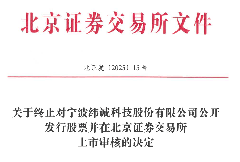 因刊行人自动申请撤回上市申报文件,近日,北交所审核官网发布了关于终止对宁波纬诚科技股份无限公司(简称:纬诚科技)公开辟行股票并正在证券买卖所上市审核的决定。