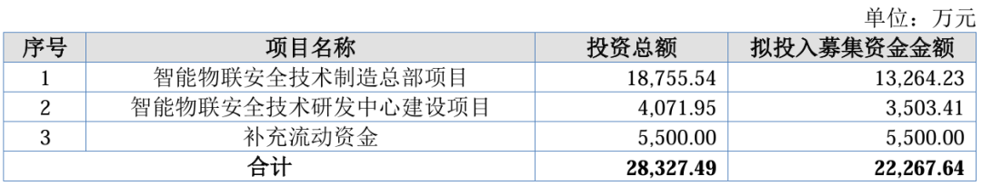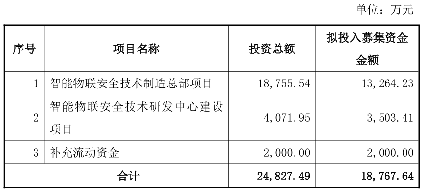 按照申报文件,纬诚科技本次IPO拟募集资金2。23亿元,此中1。33亿元用于“智能物联平安手艺制制总部项目”、3503。41 万元用于“智能物联平安手艺研发核心扶植项目”、5500万元用于弥补流动资金。